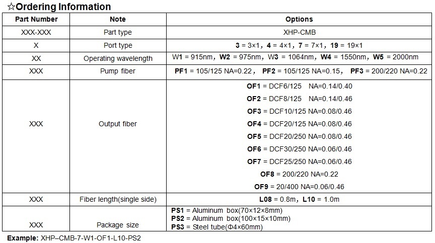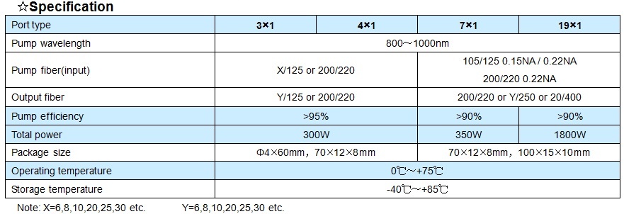 N×1 fiber pump combiner features high pump efficiency, low insert loss, cost-effective, stable and reliable. This combiner can be integrated into medium and high power fiber laser, fiber amplifier, and R&D test equipment.