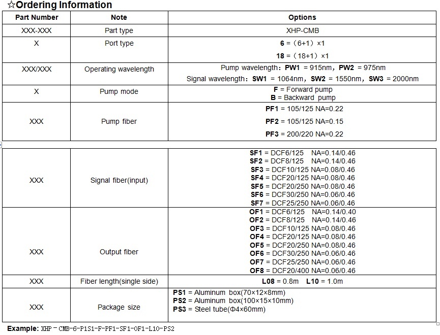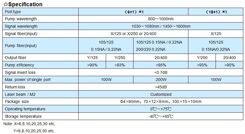 (6+1)×1/(18+1)×1 fiber pump signal combiner features high pump efficiency, low insert loss, cost-effective, stable and reliable. This combiner can be integrated into medium and high power fiber laser, fiber amplifier, and R&D test equipment.