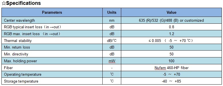 XHP RGB fiber combiner features low insert loss, stable and reliable. It can be integrated into fiber communication system, fiber sense, laser microscope, laser display, and biomedicine etc.