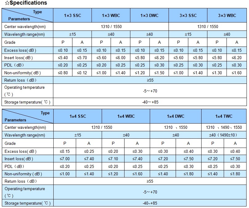 XHP 1×3/ 1×4 single mode fiber coupler features low insert loss, high return loss, low PDL, stable and reliable. It can be integrated into fiber communication network, fiber sense system, and fiber test equipment etc.