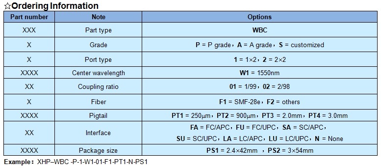 XHP 1×2 1/99 1550nm fiber coupler features low insert loss, high return loss, low PDL, stable and reliable. It can be integrated into fiber communication network, fiber sense system, and fiber test equipment etc.