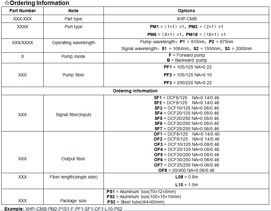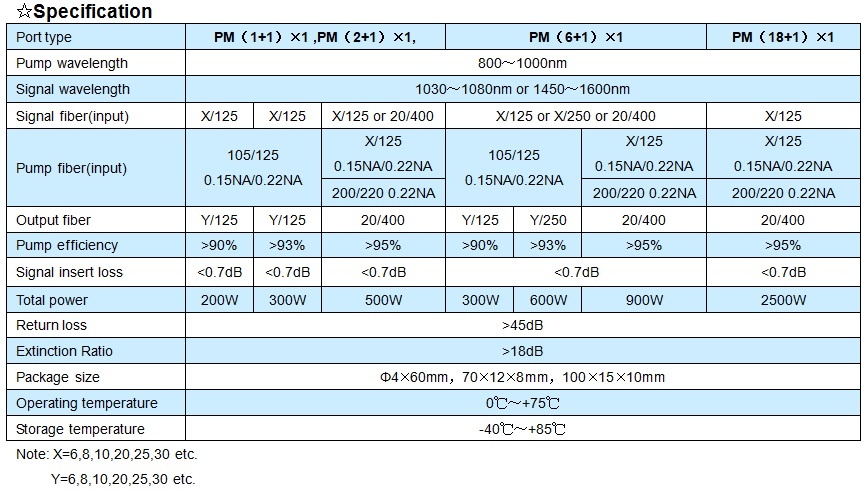 PM(N+1)×1 Polarization maintaining fiber combiner features high pump efficiency, low insert loss, high extinction ratio, stable and reliable. This combiner can be integrated into medium and high power fiber laser, fiber amplifier, fiber sense system and R&D test equipment.