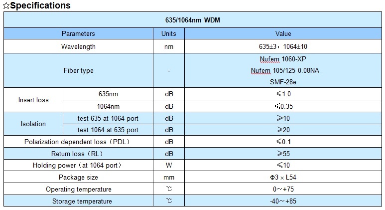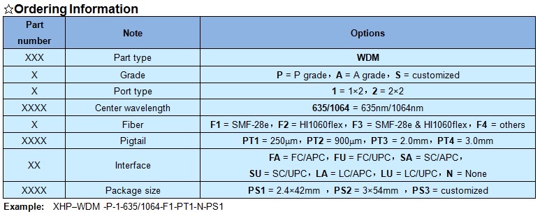 XHP 635/1064 fiber WDM features low insert loss, high return loss, high isolation, high extinction ratio, stable and reliable. It can be integrated into fiber communication network, fiber laser and fiber test equipment.