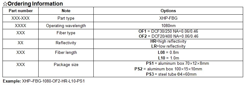 XHP high power fiber gratings feature all-fiber structured, high holding power, low insert loss, stable and reliable. The fiber gratings can be integrated into medium and high power fiber laser, fiber amplifier, and R&D test equipment.
