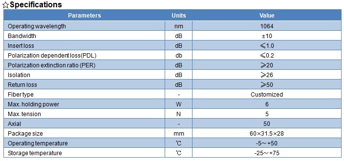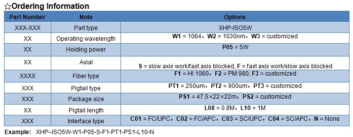 XHP 5W fiber isolator features low insert loss, high isolation, small package size, stable and reliable. It can be integrated into fiber laser and optical instrument etc.