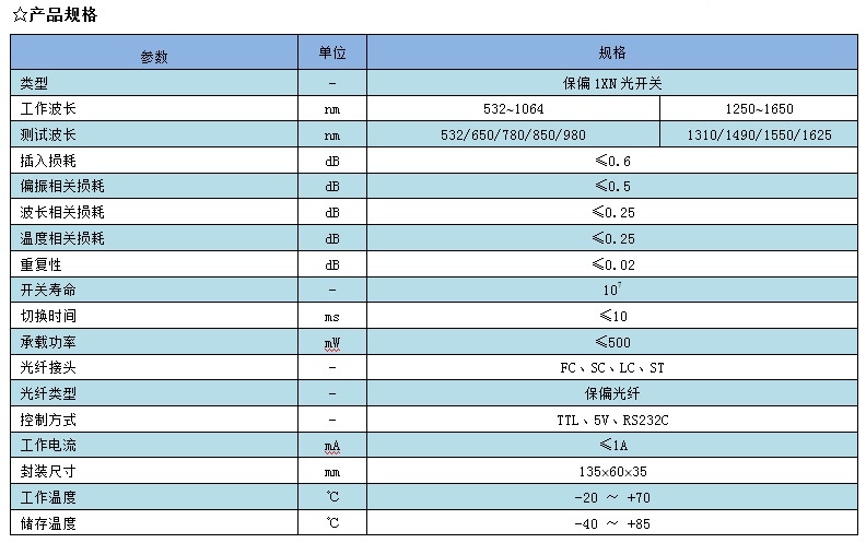 (XHP-PMOSW) 1xN 保偏光開(kāi)關(guān)模塊低插入損耗,切換快速,低PDL和WDL,穩(wěn)定可靠。適用于保偏光纖設(shè)備系統(tǒng)和保偏光纖測(cè)試系統(tǒng)等。
